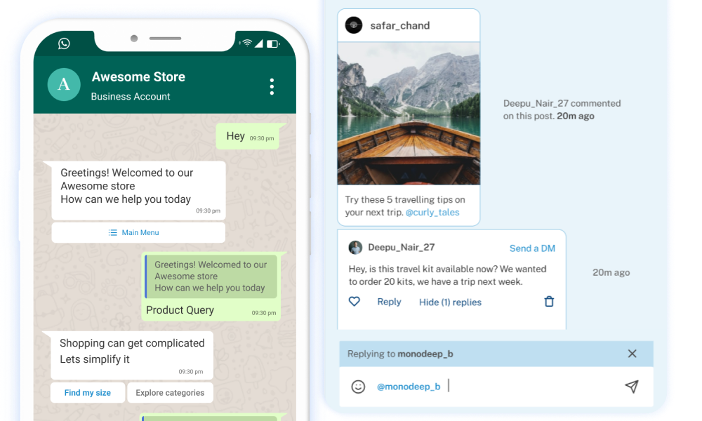 Reach your customers on their favourite communication platform, resolve queries instantly, offer personalized sales, and craft a delightful experience - all from one platform